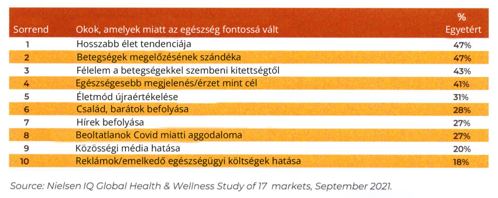 A globális wellnesspiac virágzik. A fogyasztók továbbra is többet kívánnak költeni olyan termékekre, amelyek javítják egészségüket. A grafikon az egészség- és wellnesspiac méretének emelkedő trendjét mutatja. Manapság sok fogyasztó proaktív, és bevétele egy részét életmódalapú wellness-stratégiákra költi. Ez a wellnessgazdaság lényege, hiszen a fogyasztók szeretnék beépíteni mindennapjaikba a wellnesstevékenységeket és -életmódot. Nielsen 2021-ben végzett tanulmánya bemutatja a tíz legfontosabb okot, amiért a fogyasztók az egészséget választották prioritásként.