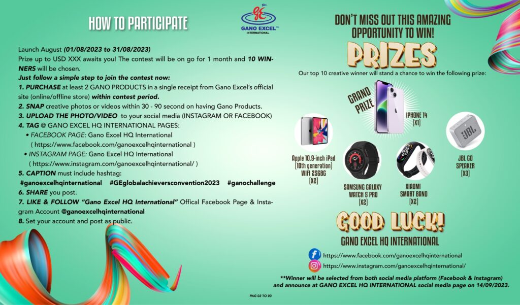 **A nyerteseket mindkét közösségi média felületről (Facebook és Instagram) választjuk ki, és a GANO EXCEL HQ INTERNATIONAL közösségi oldalán hirdetjük ki 2023.09.14-én.