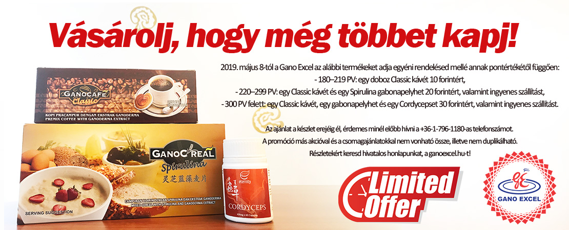 Figyelem! Az ajánlat a készlet erejéig érvényes, nem vonható össze az akciós csomagokkal, illetve egyéb promócióval. A termékek nem szabadon választhatók vagy cserélhetők, és magasabb rendelési érték esetén sem duplikálhatók. Rendelésért vagy kérdés esetén hívd a +36-1-796-1180-at, vagy írj az info@ganoexcel.hu e-mail-címre.