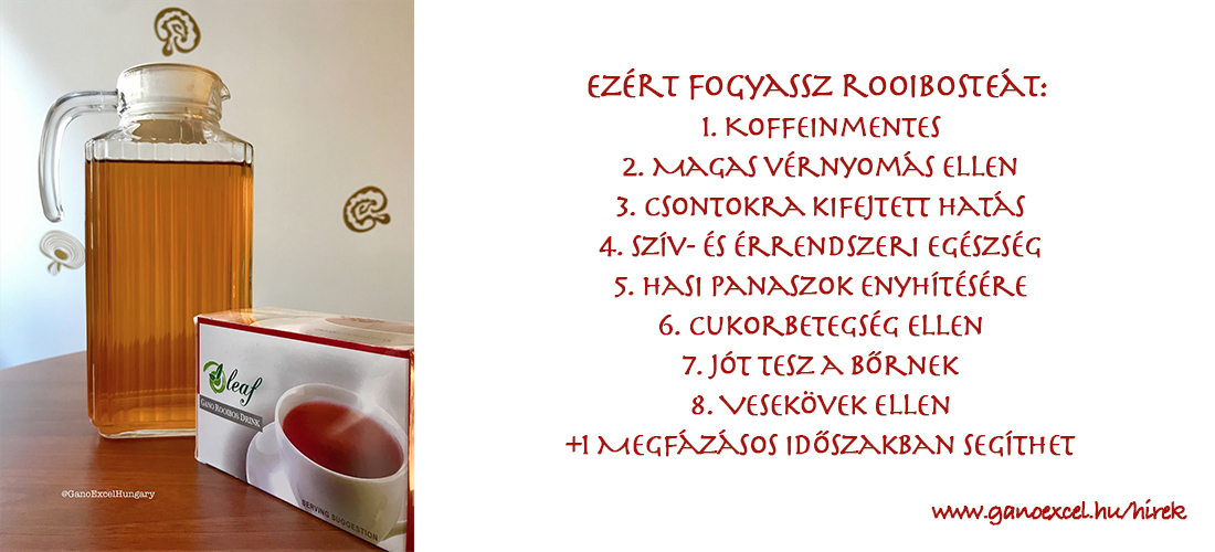 A megelőzés és a kúra része egyaránt lehet a bőséges folyadékfogyasztás. Egy filter rooibosteát – amelynek esetleges pozitív hatásairól itt cikkeztünk – másfél liter vízben feloldva kipipálhatod a javasolt mennyiség felét, ízlés szerint citrommal és/vagy mézzel ízesítheted, vagy fogyasztóinkhoz hasonlóan több célból is hasznosíthatod. A legutóbbi terméktapasztalatot Szelei Klára osztotta meg velünk az info@ganoexcel.hu e-mail-címre írva; ezúton is köszönjük neki az ajánlást. „Nekem mindegyik termékről jó a tapasztalatom. A spirulinás gabonapelyhet imádják az unokáim, a Gano kávék pedig nem hiányozhatnak mindennapjainkból. Jól beállítják a gyomor működését, csak ajánlani tudom mindenkinek. A rooibostea több szempontból is hasznos, és áztatva a legjobb. Este belerakom egy literes kancsóba – hideg vízbe –, reggelre szép aranysárga lesz, és finom ízű. Én higítva iszom, tehát félig töltöm a poharat, és hozzáöntök még meleg vizet. Nagyon jó méregtelenítő és gyulladáscsökkentő, főleg influenzás időszakban. A filtert nem veszem ki azonnal, áztatom még, semmi baja sem lesz. A használt filtert rágcsálni is lehet, nagyon jó a fogínyre, illetve fájós testrészekre is rá lehet tenni fájdalomcsillapító és gyulladáscsökkentő hatása miatt. Az elhasznált filtert a végén nem dobom ki, a virágcserépben lévő föld tetején szétszórom. Mindenkinek kívánok nagyon sok jó terméktapasztalatot!”