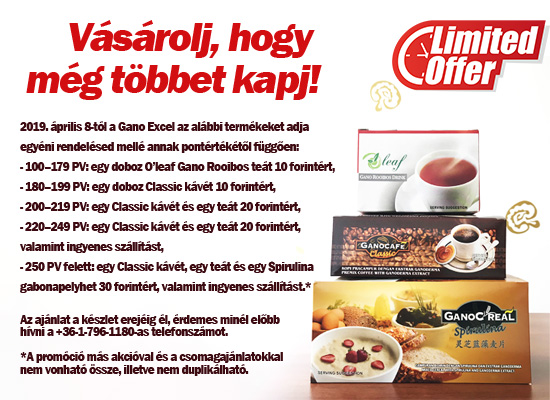 Bizonyára olvastad előző hírlevelünket, amelyben arról számoltunk be, hogy 2019. április 8-tól a készlet erejéig 100 PV felett egy doboz O’leaf Gano Rooibos Drinket (a továbbiakban: rooibosteát), 180 PV felett egy doboz Classic kávét, 200 PV felett egy Classic kávét és egy rooibosteát, 220 PV felett ezeken kívül ingyenes szállítást, 250 PV-t meghaladó vásárlás esetén Classic kávét, rooibosteát és spirulinás gabonapelyhet küldünk a szállítási költség átvállalásán túl. (A részletes feltételeket honlapunkon olvashatod, kérdés esetén hívd bizalommal a +36-1-796-1180-as telefonszámot munkanapokon 9 és 18 óra között, vagy írj az info@ganoexcel.hu e-mail-címre.)