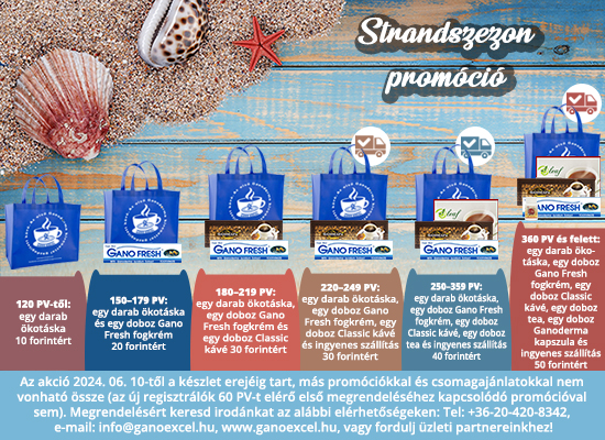 Június 10-től új, PV-alapú promóciót indítottunk „Strandszezon promóció” címmel. Az akció a készlet erejéig tart, és nem vonható össze más promóciókkal és csomagajánlatokkal (az új regisztrálók 60 PV-t elérő első megrendeléséhez kapcsolódó promócióval sem, tehát az ebben az időszakban regisztrálók, amennyiben például elérik a 120 PV-t első megrendelésükkel, akkor választaniuk kell, hogy a 60 PV-hez kapcsolódó Classic kávét, vagy pedig a fogkrémet kérik). Reméljük, hogy sokatok érdeklődését felkeltjük új promóciónkkal. Várjuk megrendeléseiteket!