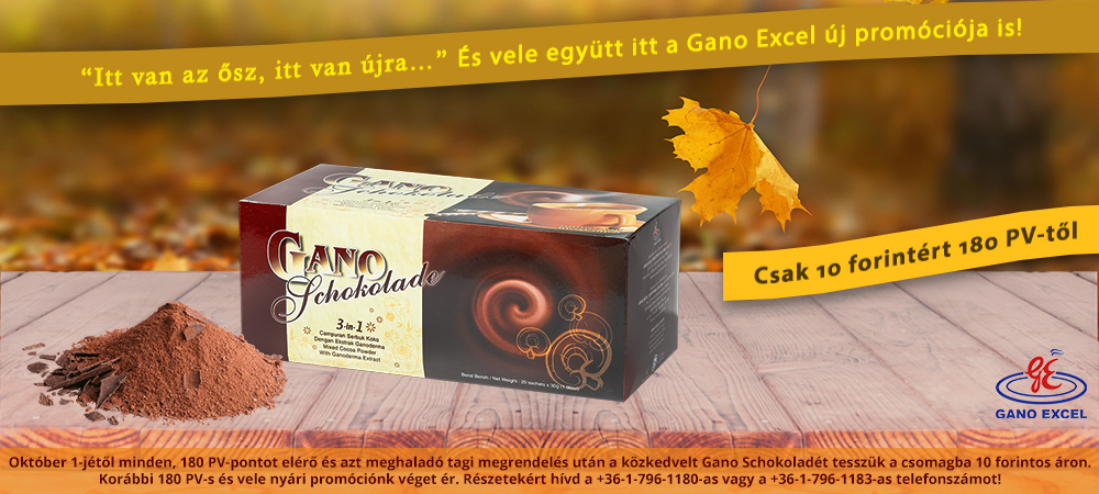 Október elsejétől megváltozik állandó promóciónk. 3 az 1-ben kávé helyett mostantól visszavonásig Gano Schokoládét adunk minden tagunknak a 180 PV-s értéket elérő és azt meghaladó megrendeléseikhez, 10 forintos áron. Részletekért hívd az irodát!